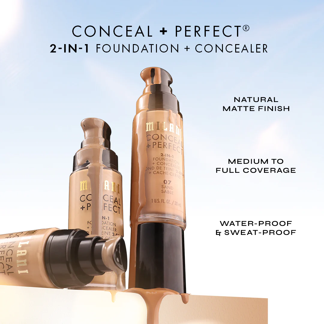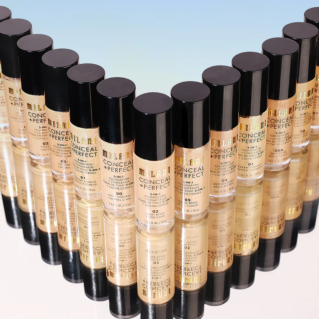 Meet the makeup multi tasker! The Milani Conceal + Perfect 2-in-1 Foundation + Concealer combats defiant under eye circles, unwanted redness and other skin imperfections. Milani Conceal + Perfect 2-In-1 Foundation + Concealer gives you a bright, bold finish in one flawless skin-perfecting step.